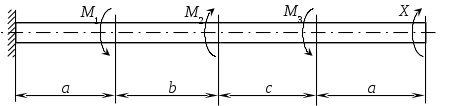 К стальному валу приложены три известных момента М>1>, М>2>, М>3>. Требуется: 1) установить, при каком значении момента Х угол поворота правого концевого сечения вала равно нулю; 2) для найденного значения Х построить эпюру крутящих моментов; 3) при заданном значении [τ] определить диаметр вала из расчета на прочность и округлить его значение до ближайшего, равного 30, 35, 40, 45, 50, 60, 70, 80, 90, 100 мм; 4) построить эпюру углов закручивания; 5) найти наибольший относительный угол закручивания (на 1 м).
