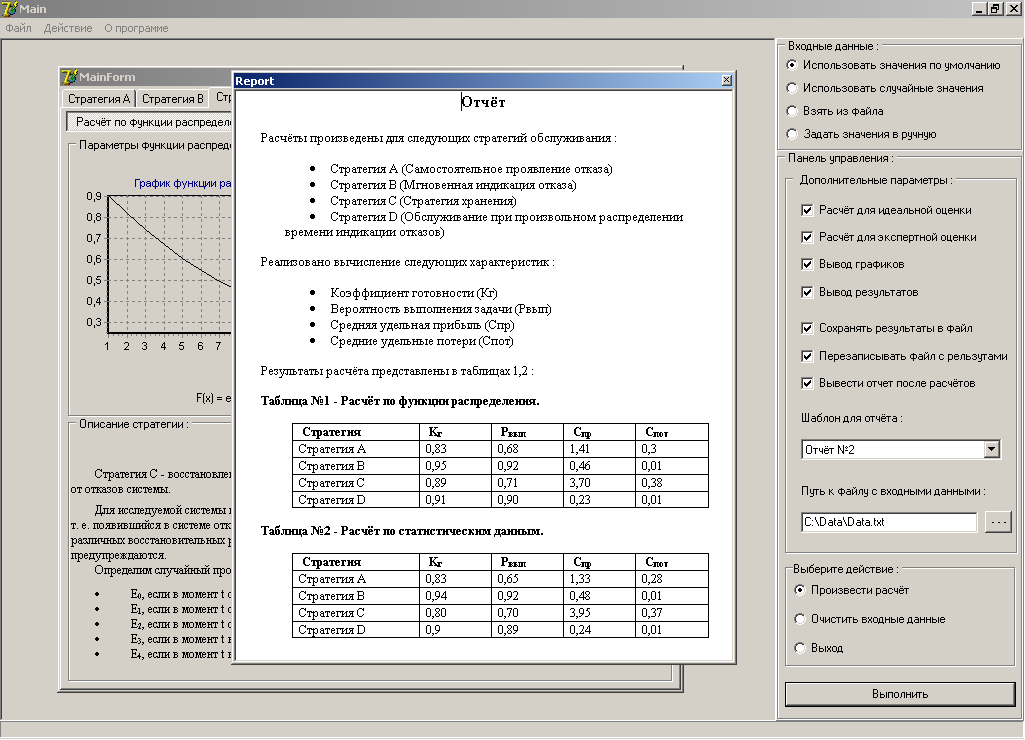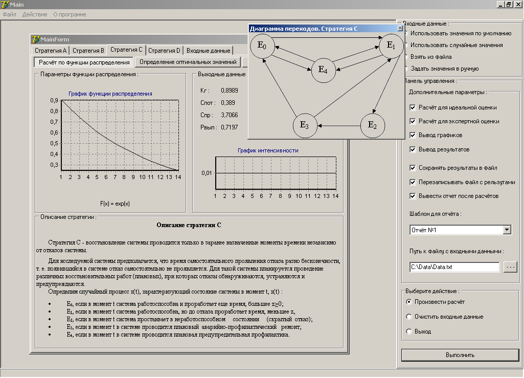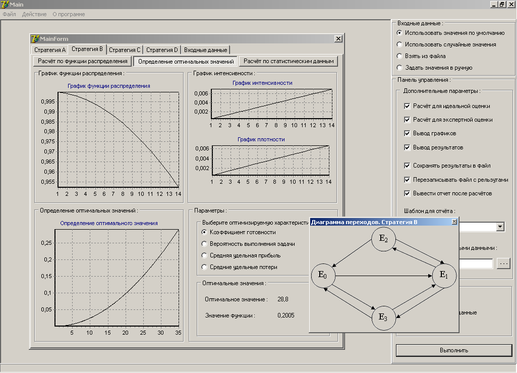 Было произведено написание, и отладка программного обеспечения для расчёта времени проведения предупредительной профилактики (для двух стратегий обслуживания). Программа имеет графический интерфейс. В программе реализован выбор стратегий обслуживания, вывод и заполнение данных, вывод результатов вычислений.