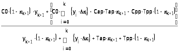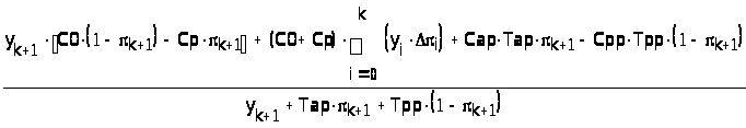 C1:=((C0*(1-pi[k+1])-Cp*pi[k+1])*y[k+1]+((C0+Cp)*Sum-Cap*Tap*pi[k+1]-Cpp*Tpp*(1-pi[k+1])))/(y[k]+Tap*pi[k+1]+Tpp*(1-pi[k+1]));