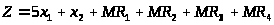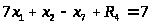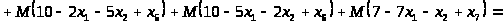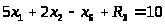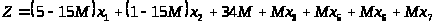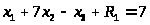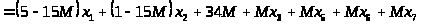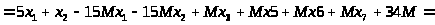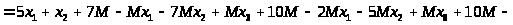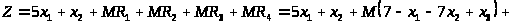 В случае, когда одно или несколько ограничений имеют знаки или = невозможно получить решение. Для получения начального допустимого базиса вводят искусственные переменные R1,R2,R3,R4. Поскольку R1,R2,R3,R4 не имеют отношение к содержательной постановке задачи, то за их применение назначается штраф. В ходе решения задачи на заключительной итерации эти переменные должны принять нулевое значение и выйти из базиса.