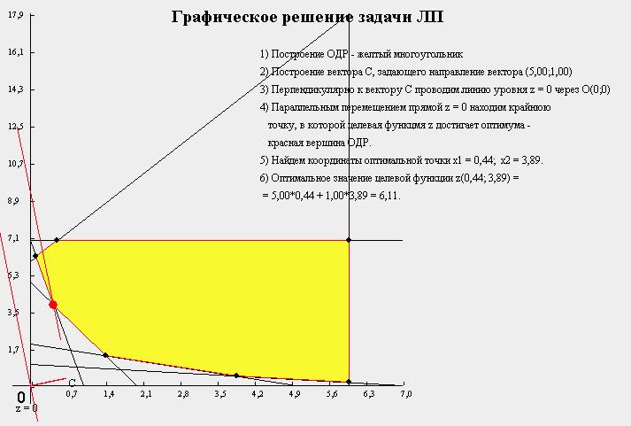 Исключаемую переменную (шаг 2) определяем по минимальному положительному отношению правой части уравнения к соответствующему коэффициенту ведущего столбца (условие допустимости - обращение в нуль данной переменной в смежной точке). Строка, соответствующая исключаемой переменной, становится ведущей. Далее определяем ведущий элемент таблицы на пересечении ведущего столбца и строки