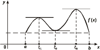 Теорема Ролля. Пусть функция f (x) непрерывна на отрезке [а, b], дифференцируема на (а, b), f (а) = f(b). Тогда существует хотя бы одна точка x, а < x < b, такая, что f '(x) = 0.