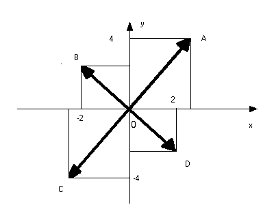 На малюнку 2 вектори ОА, OB, OC, OD є відповідними геометричними зображеннями комплексних чисел z₁= 2+2ί; z ₂= -3+4ί; z ₃= -4-3ί; z ₄= 4-2ί.
