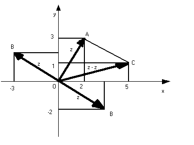 Нехай, наприклад, треба знайти геометричне зображення різниці z₁ - z₂ комплексних чисел z₁ = 2+3ί та z₂ = -3+2ί. Будуємо вектор ОА, що є зображенням числа z₁, і додаємо до нього вектор ОВ, який зображує число z₂ = -3+2ί, протилежне від’ємнику (малюнок 5). Шукану різницю зображують вектором ОС, що є сумою векторів ОА і ОВ. Йому відповідає комплексне число 5+ί.