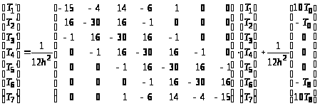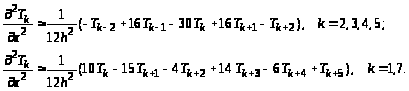 Как видно, трех точечная аппроксимация по сравнению с пятиточечной дает худший результат. Точное решение в установившемся режиме дает изменение температуры на каждой одной восьмой длины стержня 12,5°С. Пятиточечная аппроксимация в данной задаче дала погрешность в сотые доли процента.