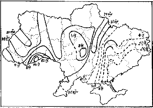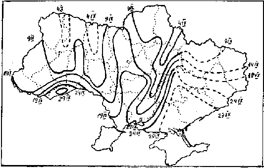 Рис. 4. Карта окончания осенней миграции белого аиста на территории Украины (по: Грищенко, Серебряков, 1992).