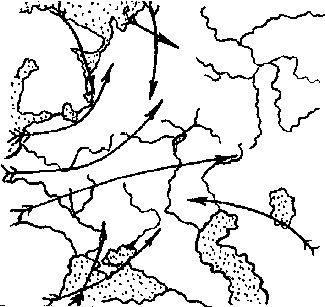 Расположение осенних пролетных путей тоже определяется действием внешних факторов (рис. 6). Западный - это кратчайший путь из Белоруссии и Прибалтики к "воротам" между Карпатами и Черным морем. Он сливается с двумя другими пролетными путями, образуя мощный поток вдоль западного побережья Черного моря. Подобно этому существование Восточного пролетного пути связано с концентрацией птиц вдоль восточного побережья Черного моря. По нему летят мигранты из центральной части Европейской России. Вполне вероятно, что существенную роль в его расположении и направленности играет гидрология региона: миграция идет с верховий Волги и Оки вдоль долины Дона в бассейн Северского Донца и дальше на восточное побережье Азовского моря. Долины крупных рек и выступают теми экологическими руслами, которые собирают потоки мигрантов. Причем они важны не только из-за наличия благоприятных мест для отдыха и кормежки, но и являются удобными ландшафтными ориентирами, ведущими кратчайшим путем к Азовскому морю (Грищенко, 1993). Понятно, что такой ход миграции энергетически более выгоден и он будет закрепляться эволюционными механизмами.
