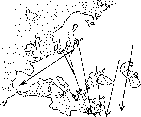 Другой пример - птица с активным полетом, серый журавль (Grus grus). Ему не нужно облетать море, как аисту, пересекают журавли и горы, например, Кавказ. Но часть птиц из района Балтийского моря мигрирует на юго-запад через Германию, Францию и Испанию (Norrevang, 1959) (рис. 3). Пролет идет полосой шириной от 300 до 400 км (Libbert, 1936; Schuz, 1971; Sanden, 1983). Пиренейский п-в журавли пересекают с северо-востока на юго-запад, часть зимует на юго-западе Испании и на юге Португалии, остальные довольно узким потоком направляются через Гибралтар в Африку (Bernis, 1960). Очевидно, в данной ситуации миграция в обход энергетически выгоднее, чем перелет напрямую через Альпы и Средиземное море, за которыми к тому же лежит Сахара. Как видно из рис. 3, Альпы журавли облетают с двух сторон, направляясь на Пиренеи и Балканы. Образование узкого фронта пролета в Западной Европе также не сложно объяснить: миграция идет кратчайшим путем к Гибралтару, и большое отклонение от пролетного пути будет приводить только к лишним энергетическим затратам. Дополнительный расход энергии "окупается" лишь в том случае, если он связан с полетом к местам отдыха и кормежки, но их также выгоднее использовать как можно ближе к основной пролетной магистрали.