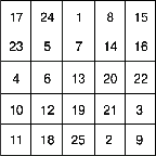 Магические квадраты нечетного порядка можно построить с помощью метода французского геометра 17 в. А.де ла Лубера (сиамский метод). Рассмотрим этот метод на примере квадрата 5-го порядка (рис. 4). Число 1 помещается в центральную клетку верхней строки. Все натуральные числа располагаются в естественном порядке циклически снизу вверх в клетках диагоналей справа налево. Дойдя до верхнего края квадрата, продолжаем заполнять диагональ, начинающуюся от нижней клетки следующего столбца (по ломаной диагонали). Дойдя до правого края квадрата, продолжаем заполнять диагональ, идущую от левой клетки строкой выше. Дойдя до заполненной клетки или угла, траектория спускается на одну клетку вниз, после чего процесс заполнения продолжается.