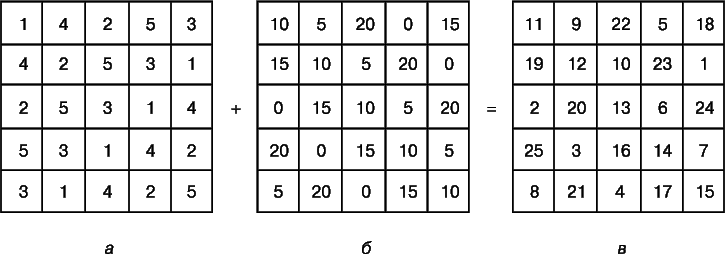Метод Ф.де ла Ира (1640–1718) основан на двух первоначальных квадратах. На рис. 5 показано, как с помощью этого метода строится квадрат 5-го порядка. В клетку первого квадрата вписываются числа от 1 до 5 так, что число 3 повторяется в клетках главной диагонали, идущей вправо вверх, и ни одно число не встречается дважды в одной строке или в одном столбце. То же самое мы проделываем с числами 0, 5, 10, 15, 20 с той лишь разницей, что число 10 теперь повторяется в клетках главной диагонали, идущей сверху вниз (рис. 5,б). Поклеточная сумма этих двух квадратов (рис. 5,в) образует магический квадрат. Этот метод используется и при построении квадратов четного порядка.