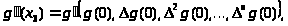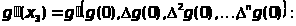 Для функции g(x), заданной своими значениями в шести точках, составить таблицу всех повторных разностей. Преобразовать функцию g(x) с помощью линейного преобразования x = a + b * k в функцию G(k) с целочисленным аргументом k. В качестве проверки правильности заполнения таблицы вычислить аналитически конечную разность Δng(x) = ΔnG(k) для n = 5.