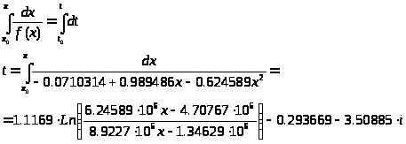 Скорость изменения переменной x(t) во времени равна функции от этой переменной f(x). Найти аналитическое выражение последней от времени, начиная с t = 0, если в начальный момент x(0) = 0. В качестве f(x) взять степенной многочлен P>2>(x), полученный в задаче 8. Протабулировать полученное решение с шагом h = 0.1 в интервале [0, 0.5].
