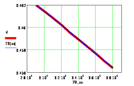 Находим аппроксимирующую функцию для зависимости диаметра балки от P3. Для этого нам необходимо определить набор функций с помощью которых будем аппроксимировать. Воспользуемся встроенной функцией linfit для определения вектора коэффициентов аппроксимирующей функции. Построить график.