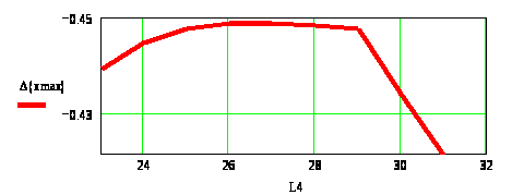 На графике зависимости минимального прогиба балки ∆(xmax) от длинны L4 получили: на участке от 23 до 25 функция ведет себя логарифмически, на участке от 25 до 29 функция ведет себя линейно, в дальнейшем функция убывает линейно.