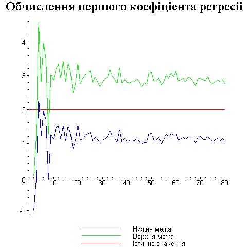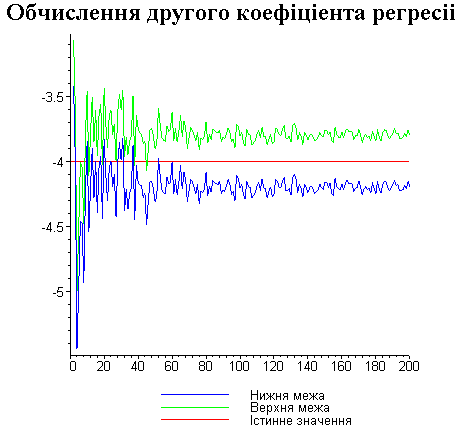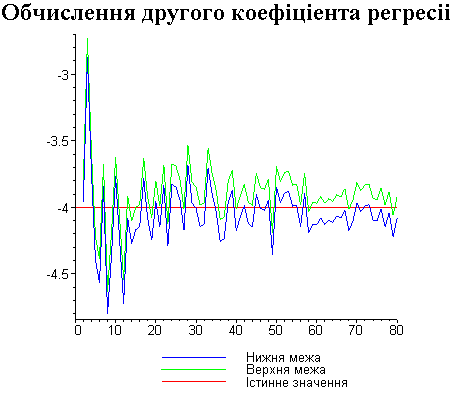 За допомогою розроблених програм в цьому ж розділі наведено результати експериментального дослідження залежності величин інтервалів, які накривають коефіцієнти регресії в залежності від об’єму вибірки та величин інтервалів в яких знаходяться значення координат вибірки.