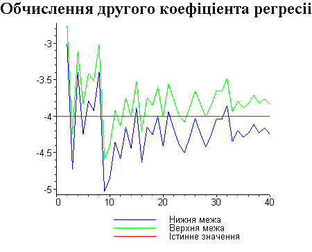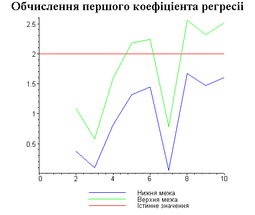 Програма повертає значення верхньої та нижньої меж інтервалів, які накривають коефіцієнти регресії. В результаті роботи цієї процедури ми отримали результати, обчислені у вигляді зручному для побудови графіка за цими даними.