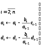 для решения этой линейной системы уравнений, конечно, можно применять метод Гаусса, но тогда пришлось бы делать много необязательных операций с нулями. Чтобы сэкономить время вычислений и не работать лишний раз с нулями, Томас (1949г.) разработал специальный алгоритм расчета. Рассчитывая по алгоритму Томаса элементы получаемой треугольной матрицы, мы следуем методу Гаусса, с уточнением, что с нулями никаких действий не производим; алгоритм Томаса называют – методом прогонки.