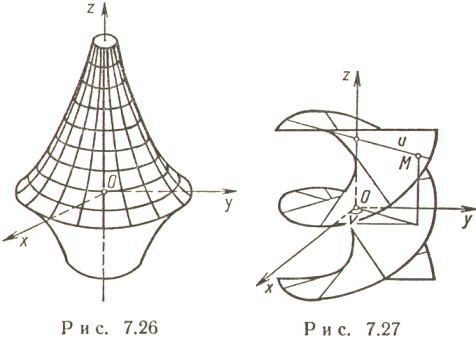 На рисунке 2 изображен геликоид. Прямой геликоид - поверхность, образованная движением прямой, вращающейся вокруг оси и перпендикулярной к ней и одновременно поступательно движущейся в направлении этой оси, причем скорости этих движений пропорциональны.