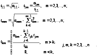 Выполняя перемножения треугольных матриц и приравнивая получающиеся элементы соответствующим элементам исходной матрицы несложно для k-той строки и m-того столбца записать
