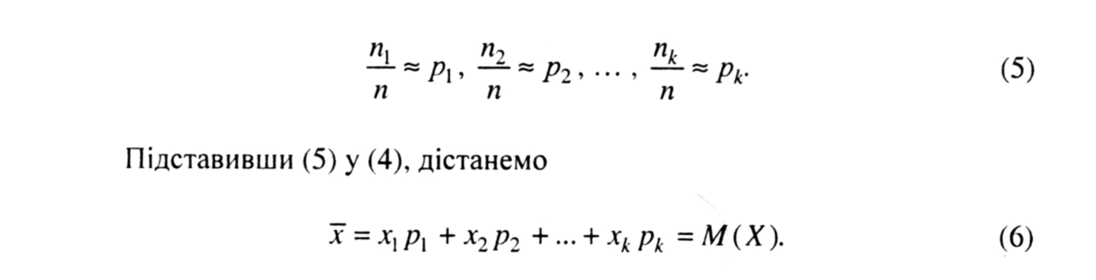 п. Зауважимо, що відношення n>1>/n є відносною частотою значення х>1>, n>2>/n є відносною частотою значення х>2>, n>k>/n є відносною частотою значення х>k>, причому відношення n>1>/n, n>2>/n,…, n>k>/n змінюються від вибірки до вибірки.