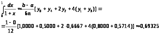 но теперь по формуле Симпсона при n=4. Разобьем отрезок [0, 1] на четыре равные части точками х>0>=0, х>1>=1/4, х>2>=1/2, х>3>=3/4, х>4>=1 и вычислим приближенно значения функции f(x)=1/(1+x) в этих точках: у>0>=1,0000, у>1>=0,8000, у>2>=0,6667, у>3>=0,5714, у>4>=0,5000.