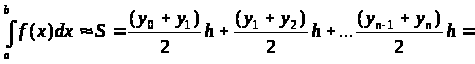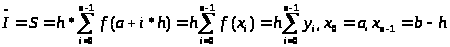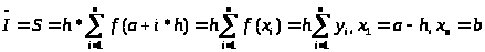 Для вычисления этой площади весь интервал интегрирования [a,b] разбивается на n равных подинтервалов длины h=(b-a)/n. Площадь под подынтегральной кривой приближенно заменяется на сумму площадей прямоугольников, как это показано на рисунке (2).