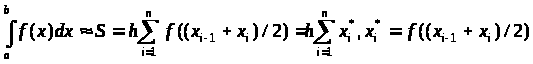 Для нахождения определенного интеграла методом средних прямоугольников площадь, ограниченная прямыми a и b, разбивается на n прямоугольников с одинаковыми основаниями h, высотами прямоугольников будут точки пересечения функции f(x) с серединами прямоугольников (h/2). Интеграл будет численно равен сумме площадей n прямоугольников (рисунок 3).