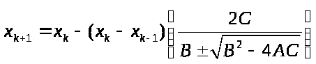 Идея метода секущих развивается в методе Мюллера. Однако в этом методе для нахождения очередного приближения используются три предыдущие точки. Иными словами, метод использует не линейную, а квадратичную интерполяцию функции. Расчетные формулы метода следующие1: