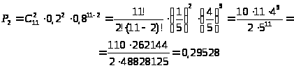 По каналу связи передаётся 11 сообщений, каждое из которых независимо от других с вероятностью р = 0,2 искажается помехами. Найти вероятность того, что: 1) из 11 сообщений ровно 2 будет искажено помехами,
