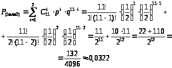 Монета подбрасывается 11 раз. Найти вероятность того, что герб выпадет: 1) 2 раза, 2) не более 2-х раз, 3) не менее одного и не более 2-х раз.