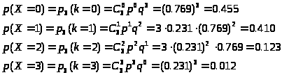 Проводится n=3 испытания Бернулли в каждом из которых p=0.231, q=1-p=0.769