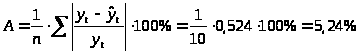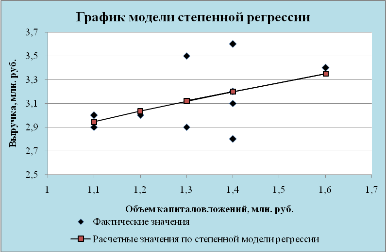 В среднем в степенной модели расчетные значения отличаются от фактических на 3,42 %. Ошибка небольшая, модель можно считать точной.