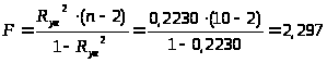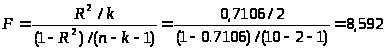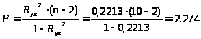 Табличное значение F – критерия при уровне значимости α = 0,05 и числе степеней свободы d.f.>1> = k = 2, числе степеней свободы d.f.>2> = (n – k – 1) = (10 – 2 – 1) = 7 составит 4,74.