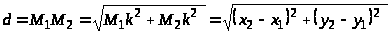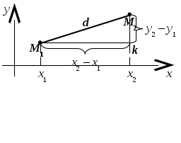 Рассмотрим прямоугольный треугольник М>1> М>2 >k. Его катеты М>1>k = х>2> – х>1>; М>2>k = у>2> – у>1>.