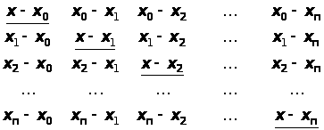 где П>n>>+1>(x) = (x - x>0>)(x - x>1>)…(x - x>n>) - произведение элементов главной диагонали таблицы (эти элементы подчеркнуты). Тогда формула Лагранжа принимает вид: