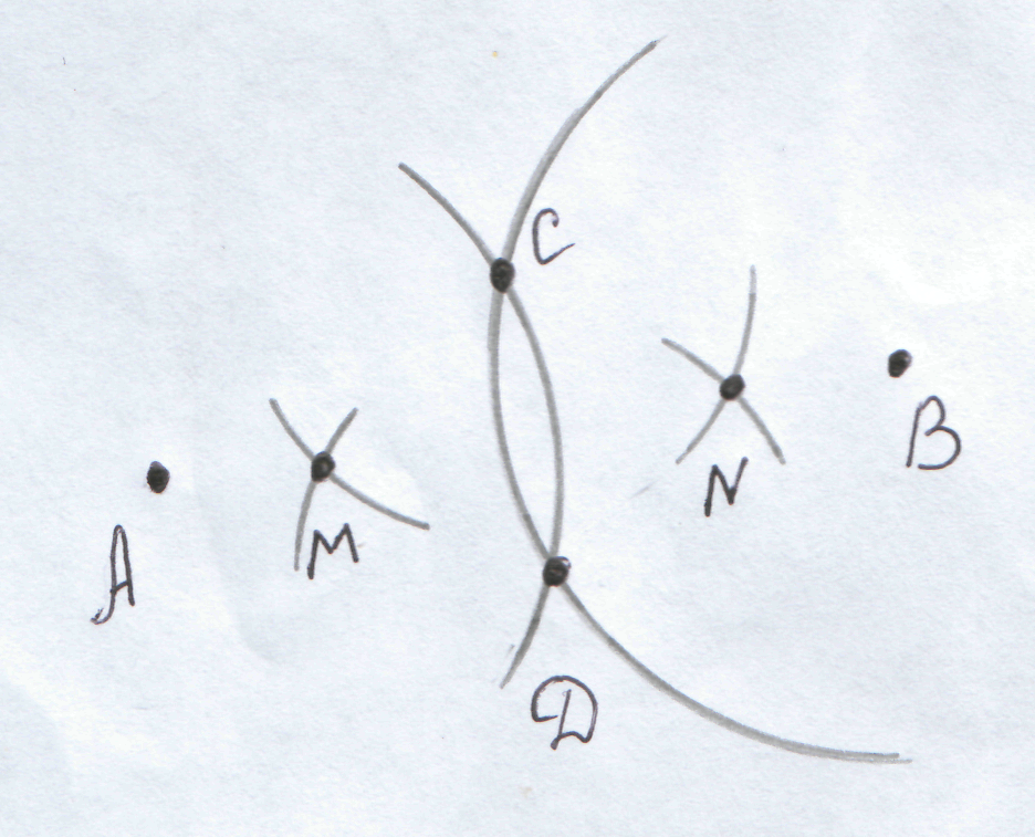 Один конец нашей неотградуированной веревки привяжем к колышку обозначающего точку А, к другому концу привяжем колышек. Из точки А проводим полуокружность в направлении точки В. Аналогично, из точки В проведем полуокружность в направлении точки А. Так как веревка используется определенной длины, то данные полуокружности будет одного радиуса. При пересечении этих полуокружностей получатся две точки С и Д (обозначим их колышками).