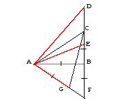 Решение: проложим перпендикуляр к прямой АВ (задача 4), пересекающий в какой–то точке луч АВ (задача 3). Будем считать для удобства, что эта точка пересечения и есть точка В. На перпендикуляре по разные стороны от точки В отложить точки С и F (задача 2), удалённые от точки В на расстояние АВ (задача 5). Тогда угол ВАС равен 45 (из равнобедренного прямоугольного треугольника АВС). На прямой AF отложим точку G на расстоянии АВ от точки А, а затем на прямой ВС отложим точку D на расстоянии CG от точки В. Тогда угол ВАD равен 6О, так как по теореме Пифагора для прямоугольного треугольников АВС, ACG и ABD имеют место равенства