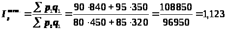 Из значения индекса постоянного состава заключаем, что если бы не было структурных изменений в реализации продукции, то цена повысилась бы на 11%.