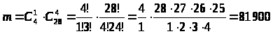 Благоприятное исход состоит в том, что вынут 1 туз из 4-х возможных и 4 другие карты из оставшихся 28, таким образом, число благоприятных способов равно: