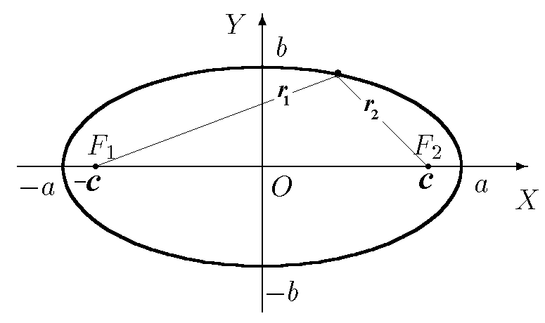 Эллипсом называется геометрическое место точек плоскости, для которых сумма расстояний до двух фиксированных точек плоскости, называемых фокусами эллипса, есть величина постоянная. Отрезки, соединяющие точку эллипса с фокусами, называются фокальными радиусами точки.