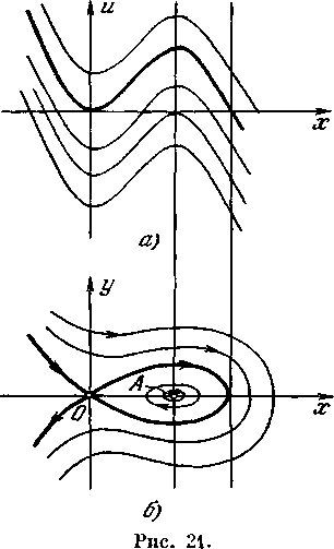 Состояние равновесия О (0, 0) системы (65) является так же, как у системы (62), седлом. Однако расположение сепаратрис седла у системы (65) (рис. 22) отличается от расположения сепаратрис системы (62).