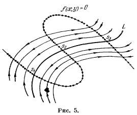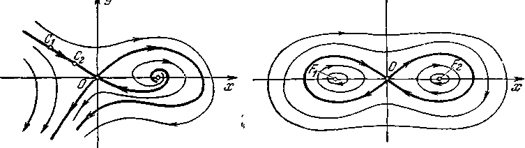 Состояние равновесия О — седло, кривая (70) является предельным континуумом для траекторий, расположенных вне нее, а каждая ее петля (вместе с состоянием равновесия О) — предельным континуумом для траекторий, расположенных внутри этой петли. Аналогично обстоит дело при