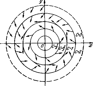 Такие методы отсутствуют даже в том случае, когда функции Ф (х, у) и F (х, у) являются многочленами.Поэтому ни в какой мере не следует думать, что знание аналитического интеграла (в тех случаях, когда он существует) сразу же решает задачу качественного исследования динамической системы: оно просто сводит одну задачу — задачу непосредственного исследования разбиения на траектории, заданного системой (I) — к задаче качественного исследования семейства кривых вида (71).Поэтому представляется целесообразным отыскание методов или приемов непосредственного качественного исследования системы (I), без предварительного нахождения аналитических выражений для решений. Прежде чем переходить к описанию таких приемов, естественно установить некоторые общие свойства разбиения на траектории. Необходимо выяснить: каким вообще может быть разбиение на траектории, определенное системой (I). Вопросом, который при этом возникает первым, является вопрос о том, какие типы траекторий вообще возможны у динамических систем вида (I). В п. 5 было установлено, что траектории могут быть состояниями равновесия, замкнутыми и незамкнутыми траекториями. Однако это еще слишком общие, неконкретные сведения о возможном характере траектории (в случае незамкнутой траектории).