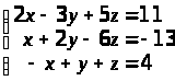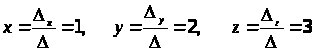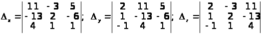 Розв’язок системи може бути знайдений за правилом Крамера, тому що detА = = 18 0. Для цього побудуємо визначники х, у, z, які відрізняються від головного визначника тим, що в ньому стовпець коефіцієнтів при, відповідно, х, у та z замінено на стовпець вільних членів, тобто: