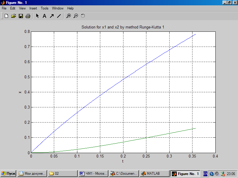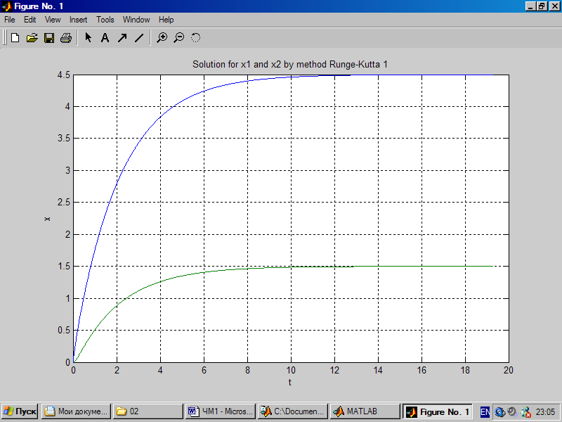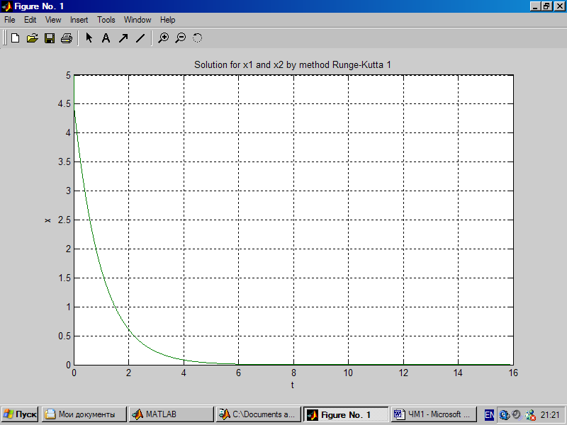 Программа написана на языке MatLAB в среде MatLAB 6.5. Для работы программы необходимо наличие операционной системы Windows 95 и выше, а также наличие среды MatLAB 6.5 (на более поздних версиях среды программа не тестировалась). Программа включает в себя 4 файлов: Start.m – головной файл, необходимый для запуска программы на выполнение и построения графика функций и ошибок, Fun.m – содержит ОДУ для вычисления, FunT – функция вычисления точного решения системы, RK1.m – содержит решение системы методом Эйлера.