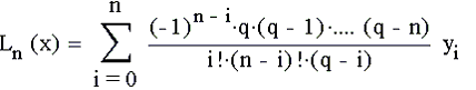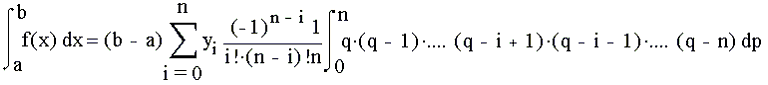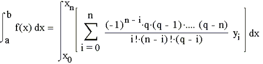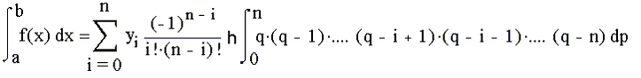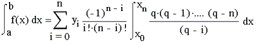 де q=(x-x0) /h – крок інтерполяції, замінимо підінтегральну функцію f(x) інтерполяційним багаточленом Лагранжа:
