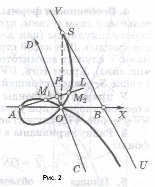 Точка O – узловая; касательные к ветвям, проходящим через O, взаимно перпендикулярны (как для прямой, так и для косой строфоиды). Для косой строфоиды (рис.2) прямая UV служит асимптотой (при бесконечном удалении вниз). Кроме того, UV касается косой строфоиды в точке S, равноотстоящей от A и B.