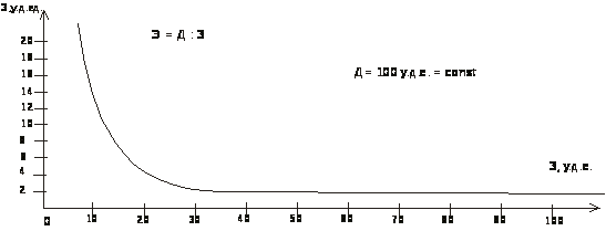 Пример: Построить график эффективности в зависимости от затрат при постоянном доходе, равном 100 у.д.е. Решение: Эффективность рассчитывается по формуле: Э = Д : З. По этой формуле строится график эффективности в зависимости от затрат при постоянном доходе (примем Д = 100 у.д.е.).