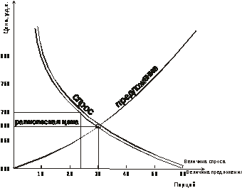 Цена, соответствующая точке на графике, находящейся в пересечении линии спроса и предложения, называется равновесной. В данном случае она равняется 668 у.д.е. Это та цена, по которой будет осуществляться купля-продажа товара при данных спросе и предложении, которые равны 30 порциям. Действительно, стоит продавцу поднять цену товара выше равновесной, например 700 у.д.е., как соответствующая ей величина спроса упадет до 25 порций. Но при этом до такой же величины должно будет упасть и предложение, что соответствует цене предлагаемого товара в 650 у.д.е. Уменьшение цены предлагаемого товара вызовет рост величины спроса, которая будет расти до тех пор, пока не приведет цену в равновесную точку: после равновесной точки дальнейший рост спроса будет ограничиваться падением цены и связанного с ним предложения. Таким образом, приход цены в равновесную точку осуществляется путем ее затухающих колебаний около равновесной точки. Тоже самое произойдет и при первоначальном установлении цены ниже равновесной точки – соответствующие изменения величин спроса и предложения возвратят цену в точку равновесия.