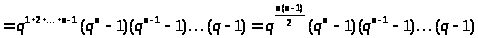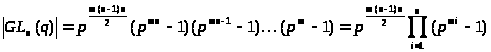 взять любую не пропорциональную первой. Таких строк qn–q. Если две первые строки уже выбраны, то в качестве третьей можно взять любую строку, не зависящую линейно от первых двух, это даст qn-q2 возможностей и так далее. Значит